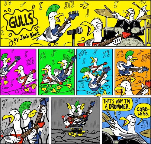 Gulls comic started in 2007. The story follows Marty Gull and his dreams of becoming a flock-star. His band Flawker Rawker never seems to take flight but they’ll take any gig they can, even if there’s no one there. You can listen to Flawker Rawker wherever you stream your music. Squawk n’ roll!
